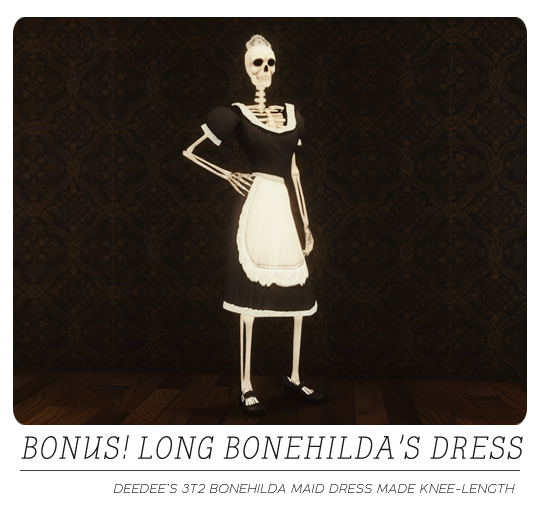 BONUS ITEM!!! i wanted bonehilda to still have her ~look~ but not be in a mini skirt when she appears in something wicked. so i pulled the skirt down on deedee's 3t2 conversion. i only included the black recolor, there is a little clipping when she does big movements, and the texture is unedited, i just pulled the mapping around to make it look normal on the new mesh. you would need the invisible stuff from sentate's original bonehilda here if you wanted to use her new dress! if you already have bonehilda in your game i'm sure you already have it lol.