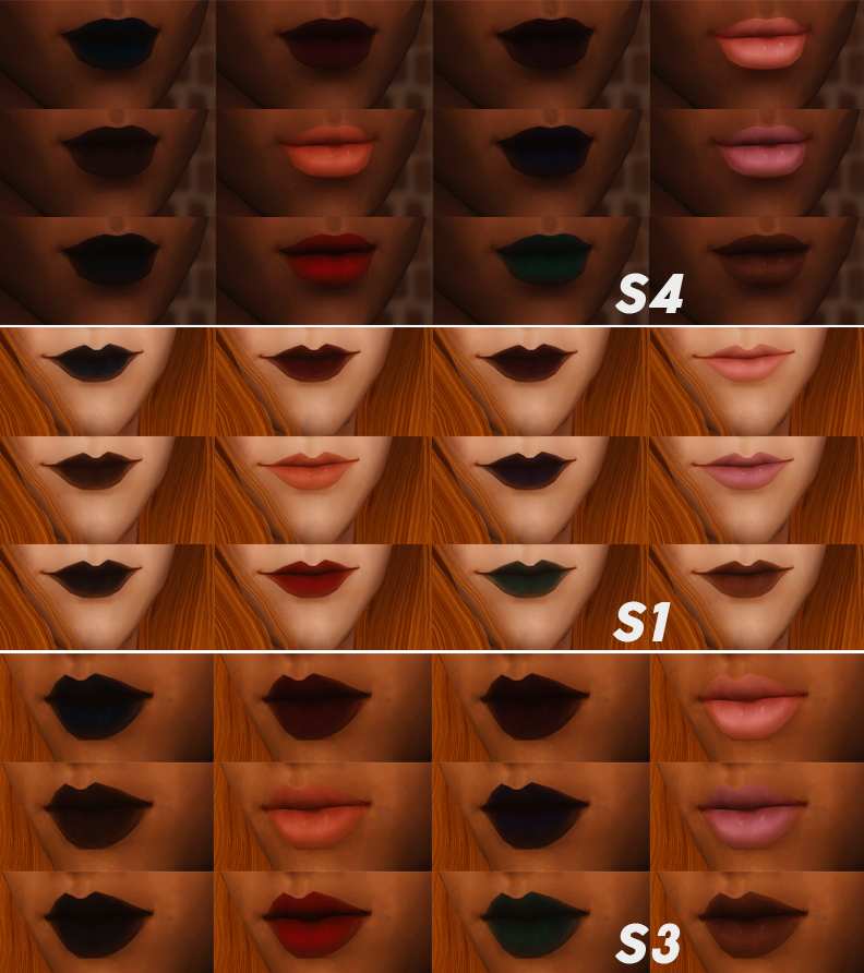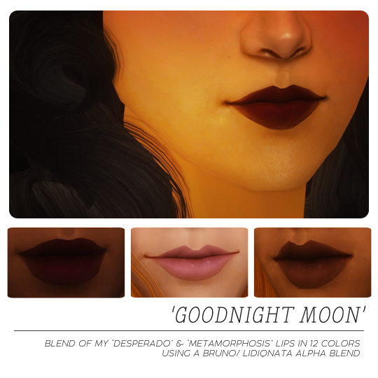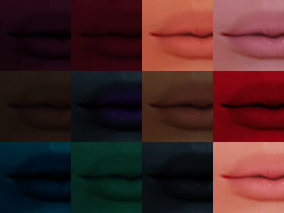 12 lipsticks!! this is my old desperado lips but the super matte lip moment has beeeeen over for a really long time for me LOL. so i put a little bit of the metamorphosis lips in too for a soft little blur and shine. i also blended slightly the bruno alpha i was using in the NYD lips with the pretty bold edge with one from a lidiqnata lipstick. idk i like how the lips are strongly colored with a strong edge but still a little blurred. these come in 2 pinks, 2 browns, a coral, for your more natural/ neutral makeup sims, and then 7 DARK colors (green, blue, black, purple black, dark plum, cool red, and a deep berry).