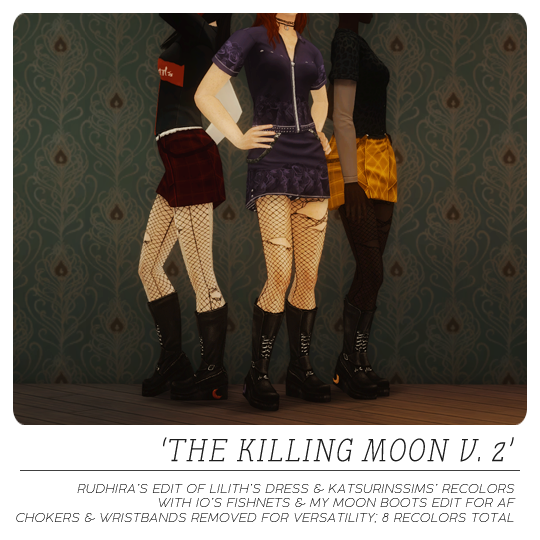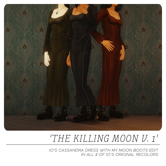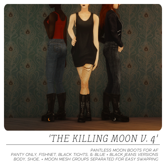 if you want to do a shoe swap, you can clone this file for bottoms, and pull its gmdc for either and you will have a separate group for the legs, boots, and moons for easy mapping. if you want to put them on a full body mesh, use this gmdc but clone the cassandra dress version for your recolor file in bodyshop because it has a moon, shoes, and body group and it saves you the step of adding groups in the property set.