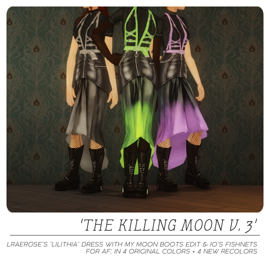 yes another swap! this one was lraerose's lilithia dress that i had previously did a shoeswap on. i thought it would be cute with these too. it has some pretty crazy clipping around the feet when they are doing big steps that is also in the maxis mesh and i can't fix it sorry! i did 4 extra recolors (pink, lime (pictured), light purple (pictured), and ghostly blue + the original 4 recolors. for mine i just messed with the selective color setting in ps til i liked it so they are experimental i guess. a swatch is included, and the moons match the dresses. the lime one has glow in the dark moons instead of just shiny metal.