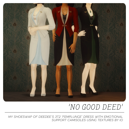 this dress by deedee that i had previously put these pointy heels on, but i don't want to have to be like why ya titty out for all my sims, so i put the silky vanity cami by io as a modesty layer. there is a swatch included bc i don't think the file names match up to the original lol.